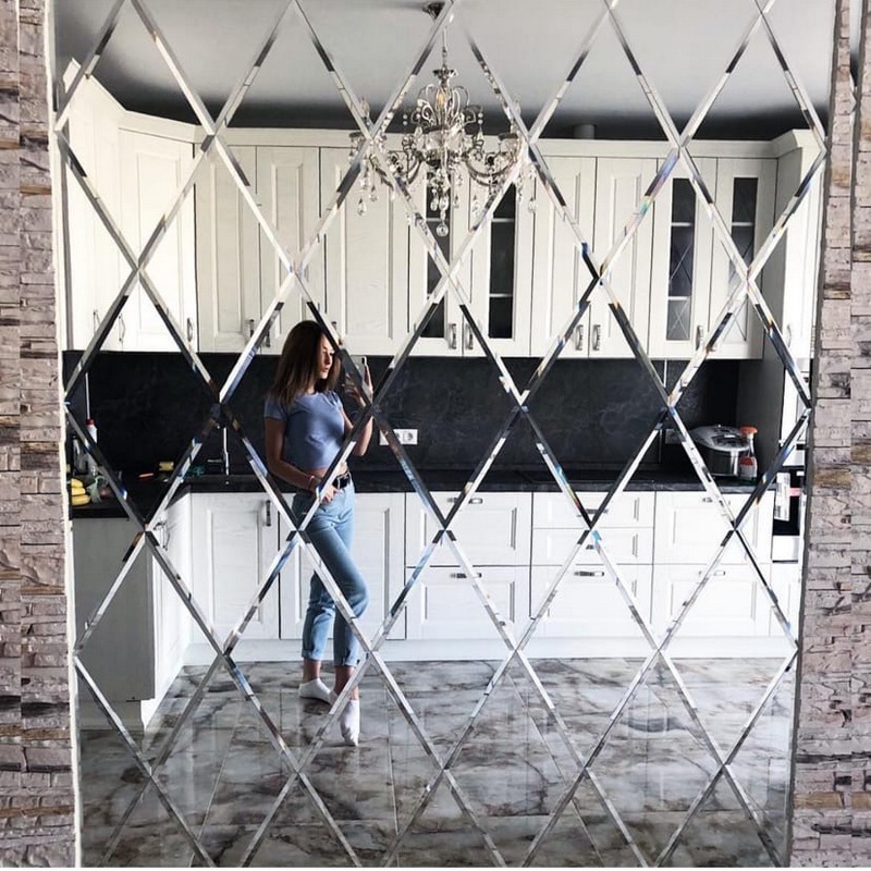 Использована серебристая квадратная зеркальная плитка размером 18х18.