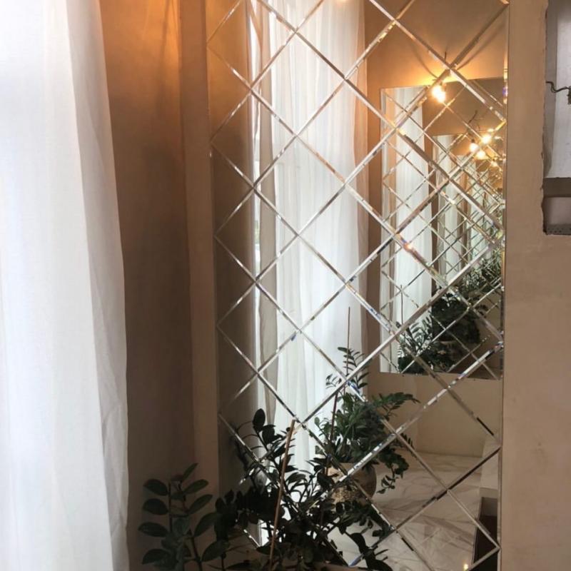 Использована квадратная серебристая зеркальная плитка размером 18х18.