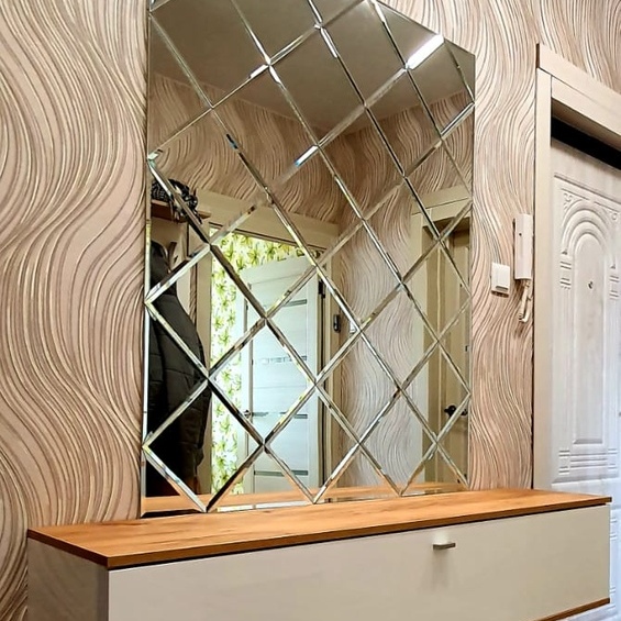 Зеркально панно было сделано из зеркальной плитки 30х30 см, размер панно 255х255 см